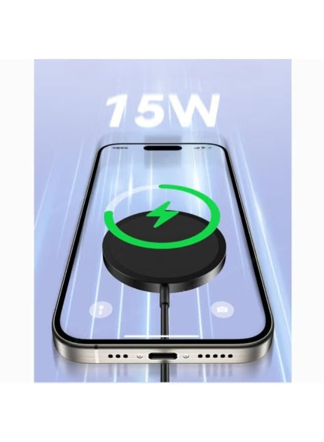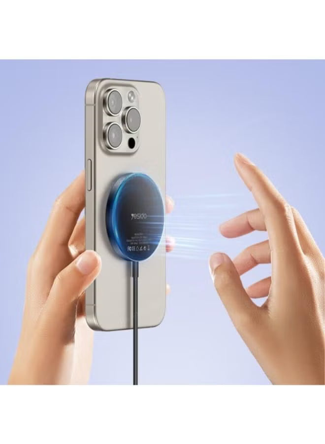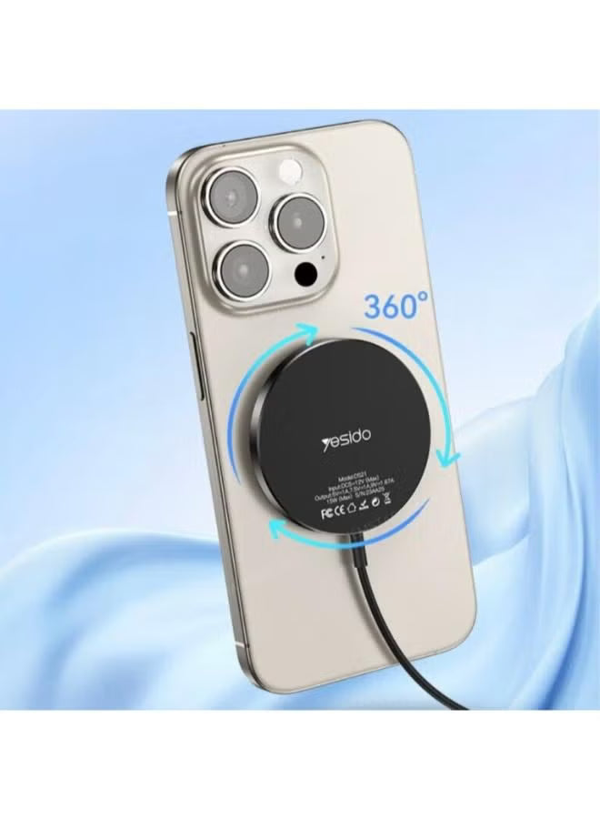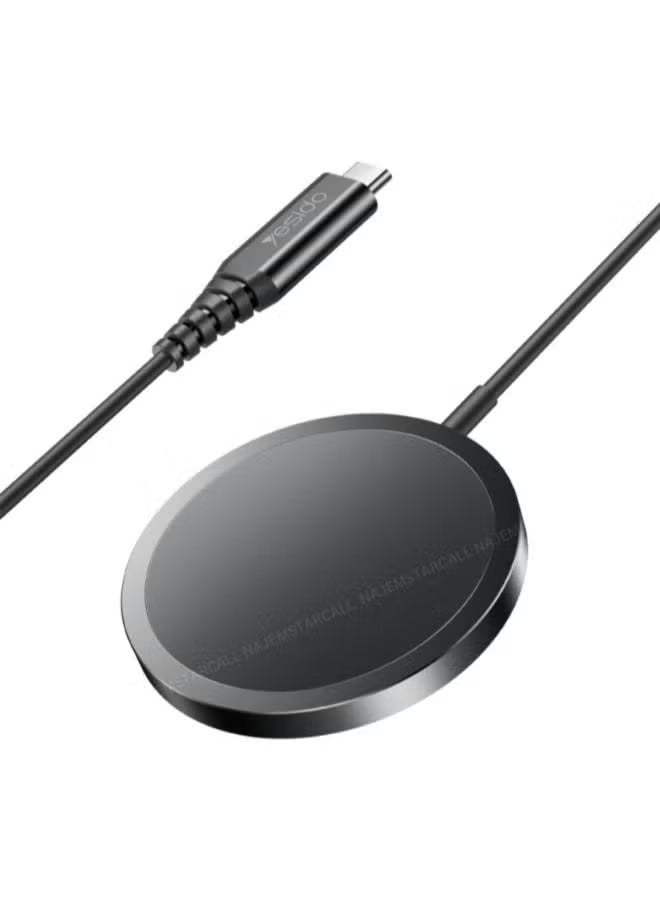 Yesido DS21 MagSafe Magnetic Wireless Charger for iPhones. Compatible with the Qi magnetic wireless charging protocol. Maximum output power of 15W. Strong magnetic contact on the back of the phone for instant charging. Intelligent temperature control. Compact size for easy portability. USB Type-C port. Cable length of 1.2 meters.