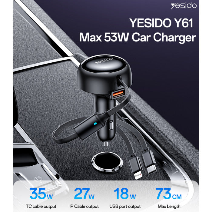 Y61 Yesido 53W Fast Charging Support Multi Charging Type-C & IP Telescopic Cable Car Charger.