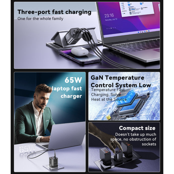 YC65 Low Temperatures 65W Fast Charging 2 USB-C & USB-A Three-port EU GaN Fast Charger