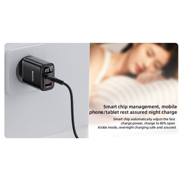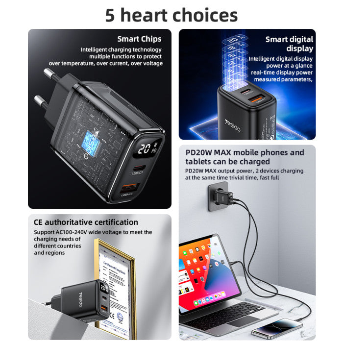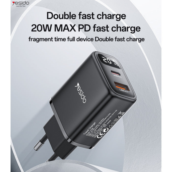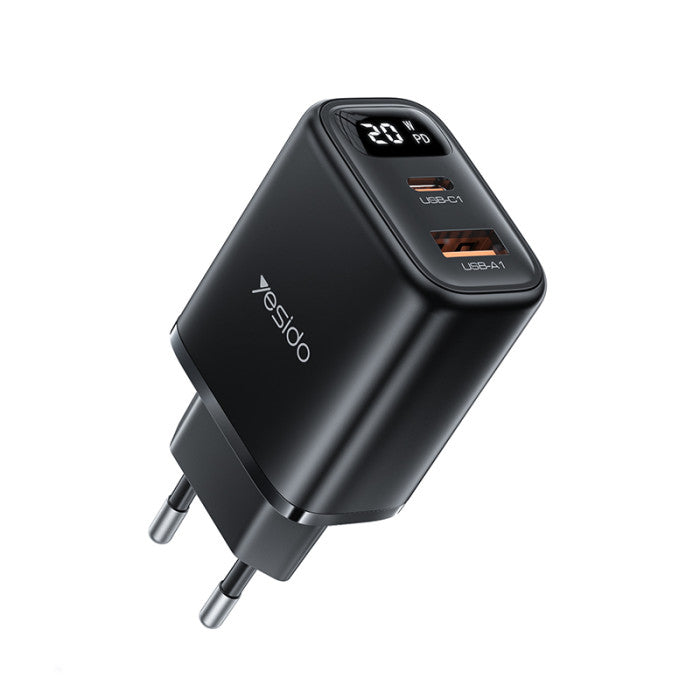 Yesido YC68 PD 20W Fast Charging Dual Port Smart Digital Display EU Digital Charger.