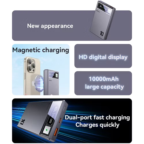 YP61 PD20W Fast Charging HD Digital Display Dual Port 10000mAh Magnetic Wireless Charging Power Bank Features Our Power Bank is 10000mAh high power ly-polymer battery. Total Max 22.5W can help...